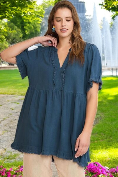 Continuar comprandoAdopte un estilo despreocupado con esta blusa de lino que cuenta con un dobladillo sin rematar que le da un encanto informal. El escote con muescas le agrega un toque moderno, mientras que la silueta babydoll ofrece un ajuste suelto y fluido para mayor comodidad. Perfecta para el clima cálido, esta blusa es liviana y transpirable, lo que la convierte en una opción elegante y relajada para un estilo fresco.