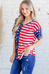 This stylish top proudly displays the American flag on the front, making it the perfect choice to showcase your love for your country. Its short sleeves make it a great option for both relaxed everyday wear and special occasions, such as patriotic holidays. For a charming and effortless ensemble, pair it with denim shorts or jeans.