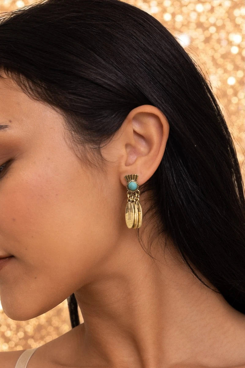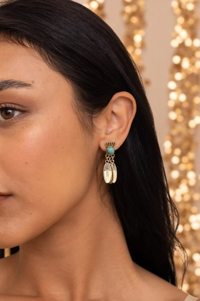 [message]Stay on trend with these antique bronze earrings, featuring beautiful turquoise stone. Combining classic style with modern fashion, these earrings are the perfect way to add a touch of glamour to any look. Get yours today! #lovemyleto