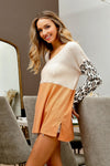 [message]Unleash your inner fashionista with this trendy knit top featuring a combination of color blocking and leopard print. The sophisticated V-neckline adds a touch of elegance to the daring design, while the comfortable knitted fabric allows for versatility and style on any occasion. Stand out and make a statement with this bold and eye-catching piece that seamlessly fuses two bold styles.