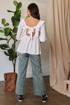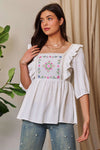 [message]Embrace timeless charm with this romantic white babydoll blouse, designed to bring a soft, feminine touch to your wardrobe. The square neckline is beautifully framed by ruffled trim and delicate floral embroidery, exuding elegance and grace. Half-length puff sleeves add gentle volume, while the peplum-style silhouette offers a flattering drape for all body types. Made from a soft, breathable cotton-blend, this blouse is a lovely choice for casual brunches, day outings, or spring-to-summer styling.