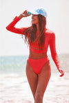 [message]Stay sleek and sun-safe with this minimalist long sleeve two-piece rash guard set. Featuring a fitted cropped top with a crew neckline and built-in shelf bra, this suit delivers the perfect balance of comfort, performance, and modern style. The solid color design keeps it versatile and timeless, while the matching high-rise bottoms offer medium bum coverage and a secure fit for all your water adventures. Whether you're surfing, swimming, or lounging, this UPF 50+ set keeps you stylish and protected.