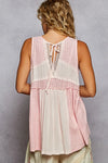 [message]Add soft romance to your wardrobe with this dreamy pleated tank top featuring a delicate blend of blush pink and cream color blocking. The pleated texture adds depth and elegance, while the lace-trimmed neckline and adjustable tie front bring a touch of feminine charm. Designed in a flowy, lightweight silhouette, this sleeveless top offers breathable comfort for warm-weather wear and effortless styling. Whether worn solo for casual days or layered under a cardigan, its bohemian-inspired details make it a go-to piece for spring and summer vibes.