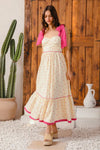 [message]Fall in love with the breezy beauty of this boho maxi dress by SO ME 🌼. With its floral print, flowy A-line shape, and vibrant pink ribbon trim, this dress adds charm and whimsy to your wardrobe. The tiered ruffle hem and puff sleeves create a feminine silhouette, while the stretchy waistband flatters your curves and keeps you comfy all day long. From brunches to beach walks or dancing barefoot in the backyard, this dress transitions effortlessly from day to night. Soft, breathable, and easy to care for—what more could a boho babe ask for? 💖💃